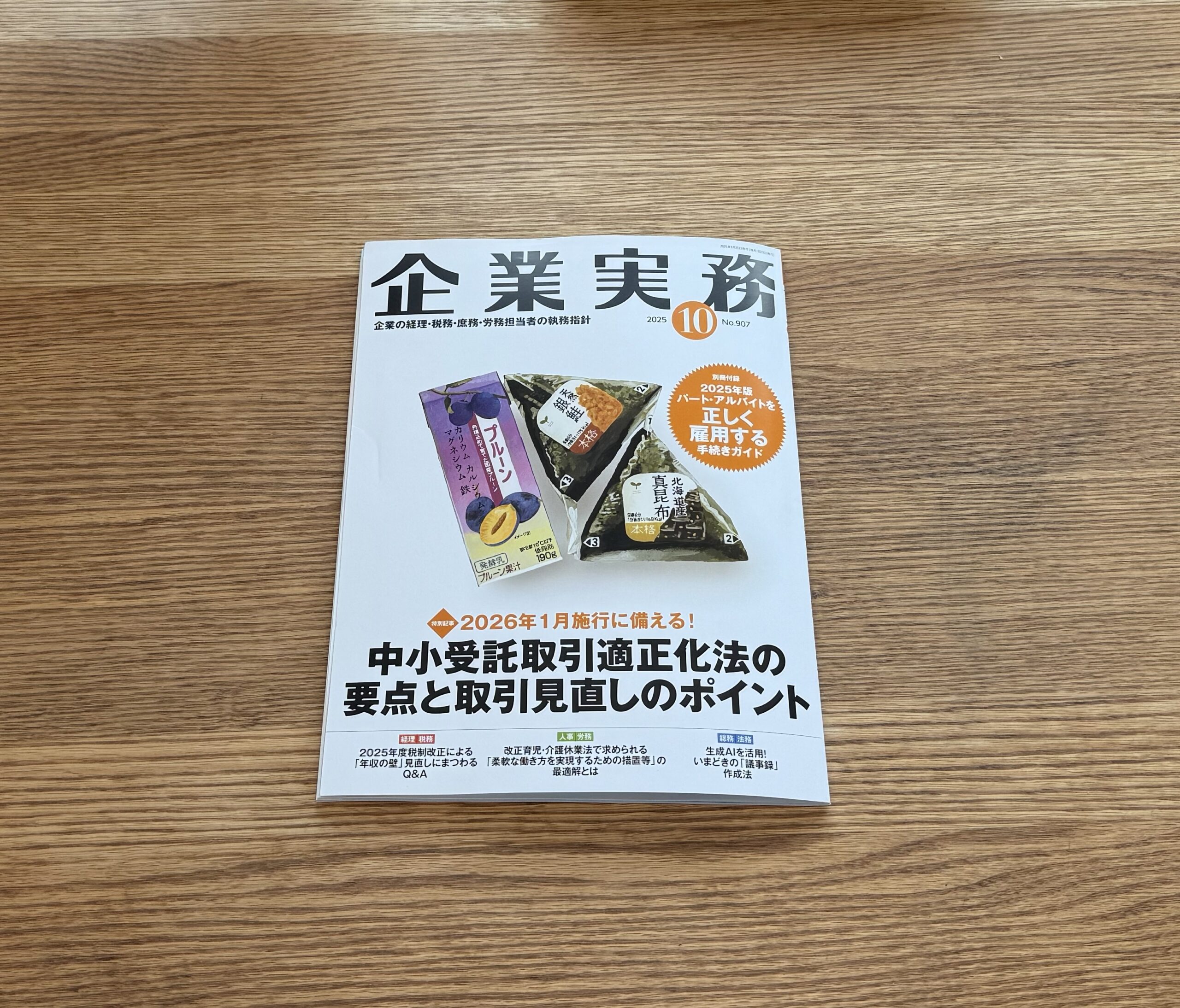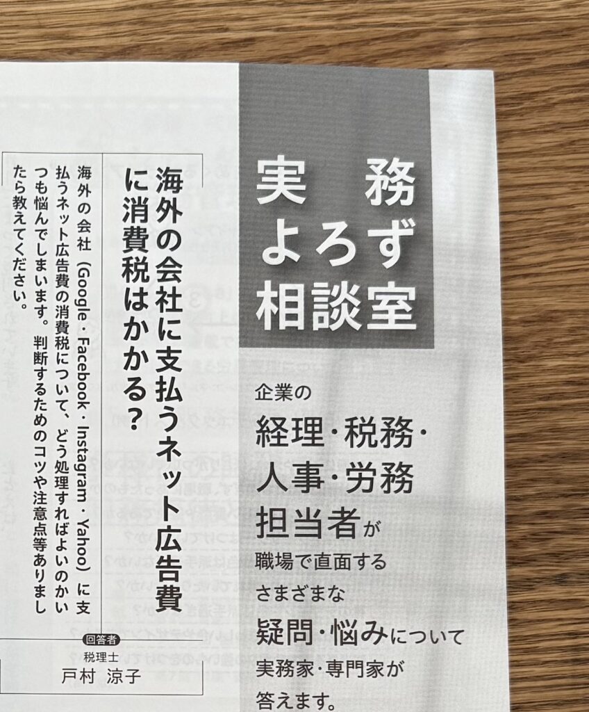 日本実業出版社が発刊する雑誌『企業実務2025年10月号』の実務よろず相談室コーナーにて、『海外の会社に支払うネット広告費に消費税はかかる?』というテーマで執筆させていただきました。(今回とあと2回、実務よろず相談室を担当します)